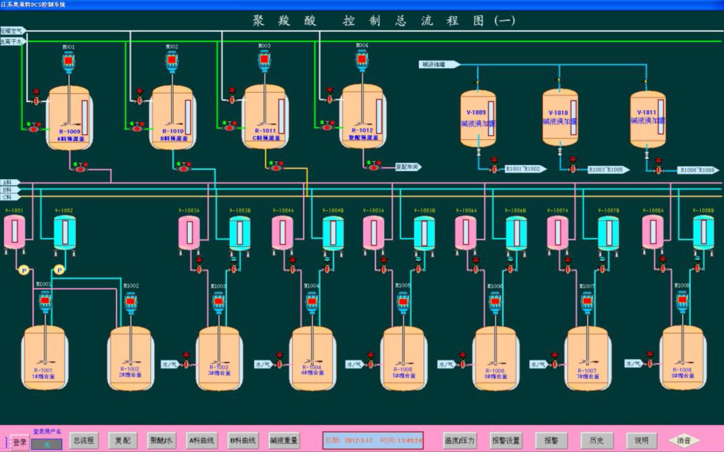 聚羧酸DCS 控制系統(tǒng)主要由預(yù)混釜,滴加罐,縮合釜及中和釜組成,包含各原料、反應(yīng)釜的重量監(jiān)測,預(yù)混釜、縮合釜釜、公用工程的壓力溫度信號的控制。完成反應(yīng)釜的滴加、釜溫控制,控制滴加罐各原料的進(jìn)料閥進(jìn)料速度,空氣、水閥的調(diào)節(jié)閥、開關(guān)閥的控制過程,以及生產(chǎn)裝置及灌區(qū)泵體的電機(jī)控制等組成。